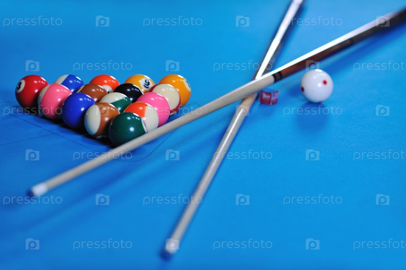 Бильярдные шары и кии, подготовленные для игры, на синем столе в бильярдном клубе