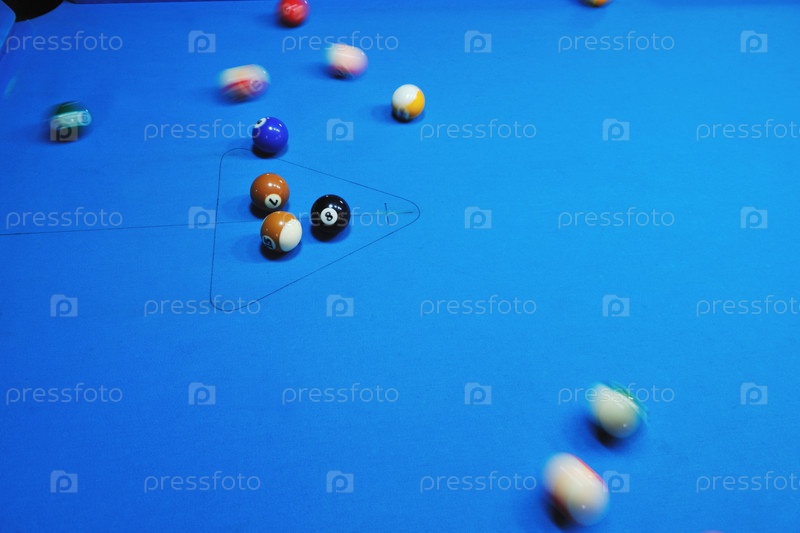 Бильярдные шары, подготовленные для игры, на синем столе в бильярдном клубе