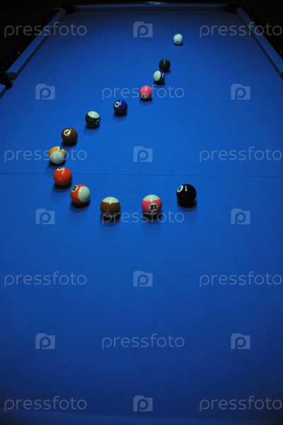 Бильярдные шары в форме вопросительного знака на синем столе в бильярдном клубе
