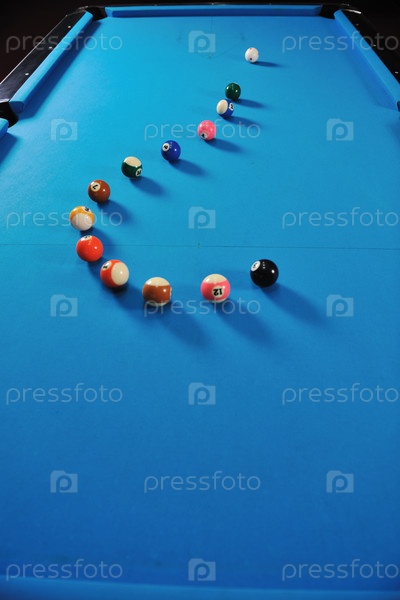 Бильярдные шары в форме вопросительного знака на синем столе в бильярдном клубе