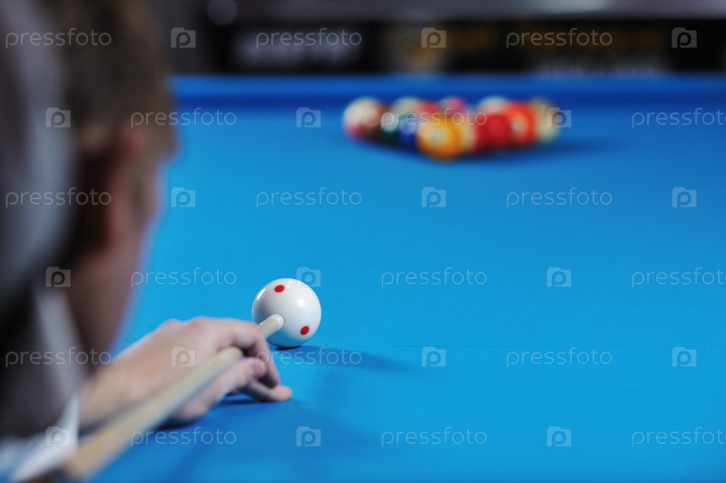Молодой профессиональный игрок выбирает наилучший угол для удара во время партии бильярда или пула