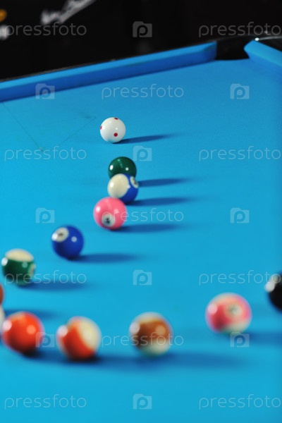 Бильярдные шары в форме вопросительного знака на синем столе в бильярдном клубе