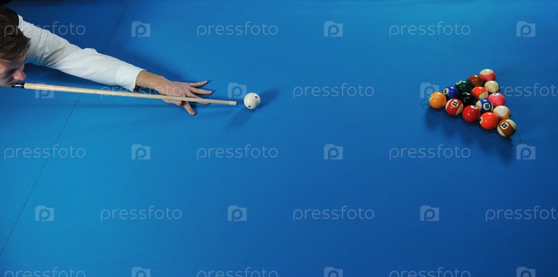 Молодой профессиональный игрок выбирает наилучший угол для удара во время партии бильярда или пула