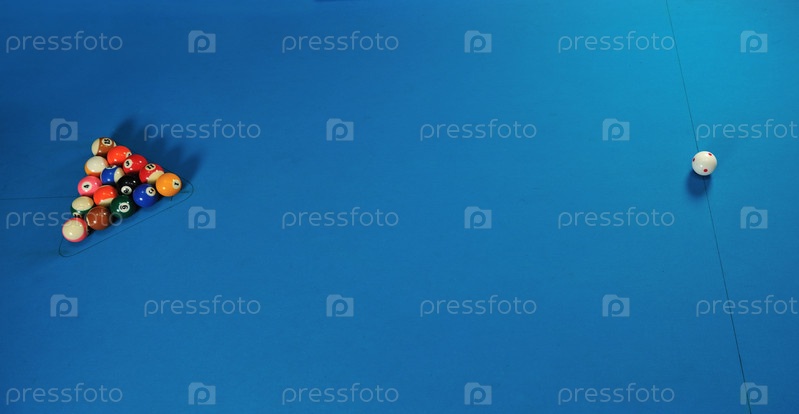 Бильярдные шары, подготовленные для игры, на синем столе в бильярдном клубе