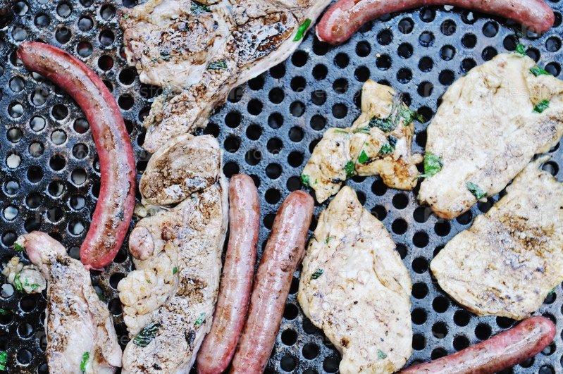 Свежий бифштекс и сосиски на гриле на свежем воздухе