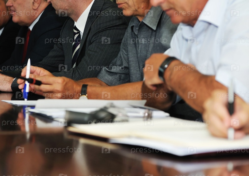 Деловые люди на конференции делаю заметки и ведут переговоры о заключении сделки