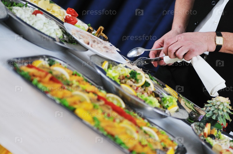 Человек накрывает шведский стол