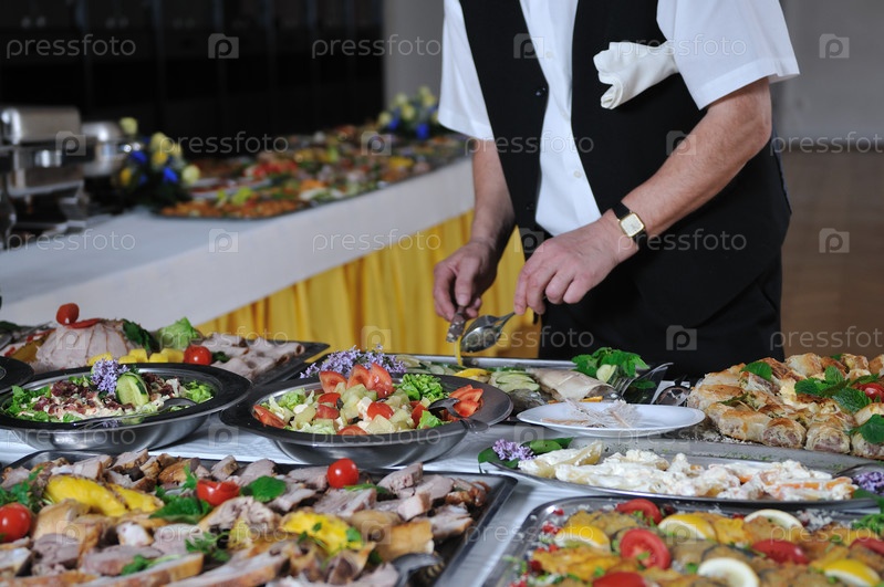 Человек накрывает шведский стол