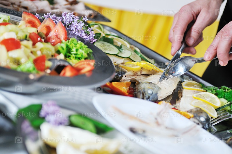 Человек накрывает шведский стол