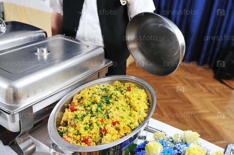 Человек накрывает шведский стол