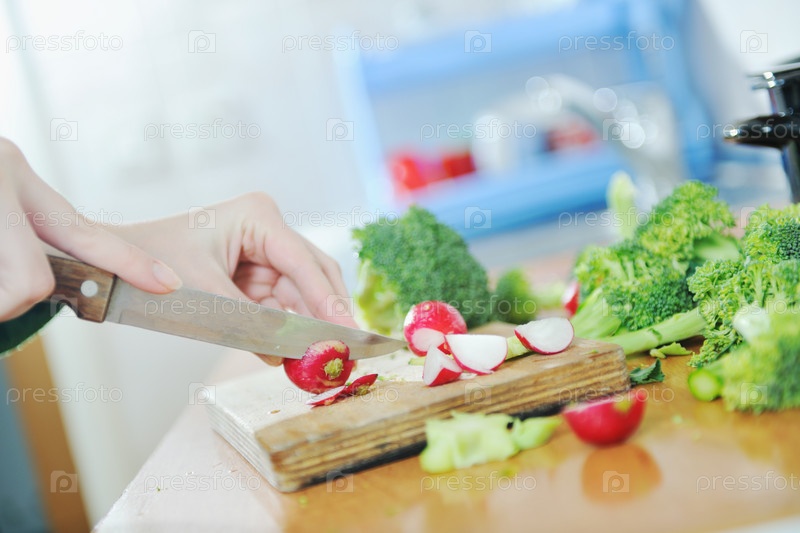 Женщина режет ножом зеленые и красные овощи для полезного салата