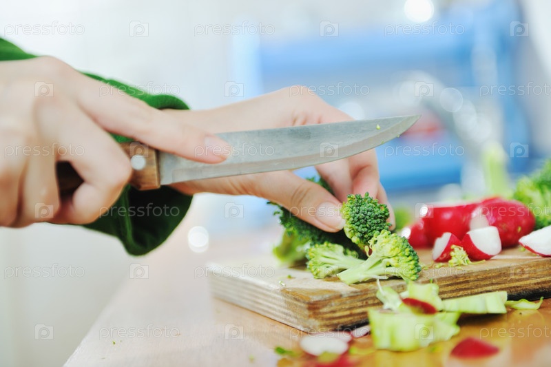 Женщина режет ножом зеленые и красные овощи для полезного салата