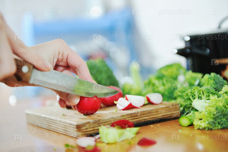 Женщина режет ножом зеленые и красные овощи для полезного салата