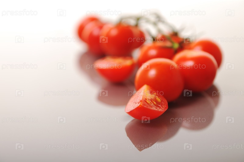 Красные влажные помидоры на белом фоне