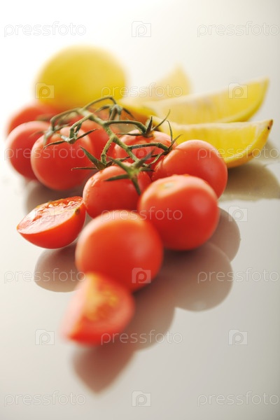 Свежие красные помидоры и лимон на белом фоне