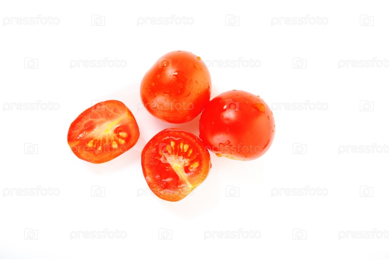 Красные влажные помидоры на белом фоне