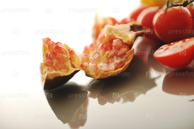 Свежие красные помидоры, гранат и лимон на белом фоне