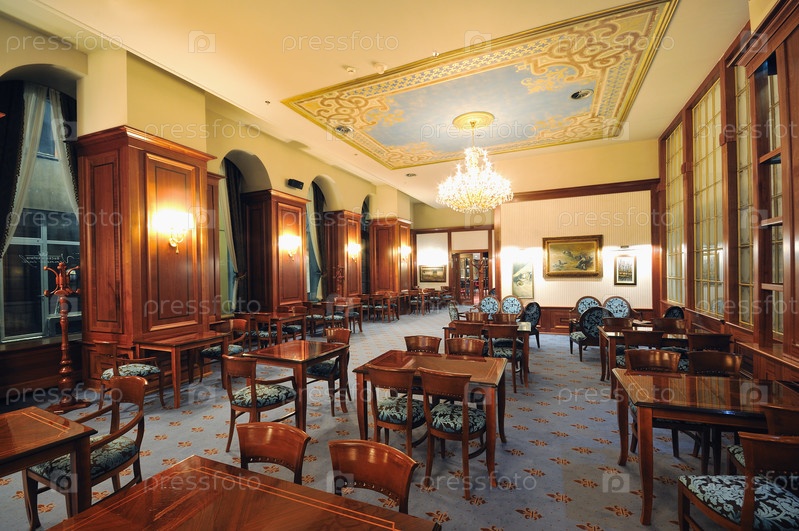 Интерьер кофейни с роскошной деревянной мебелью