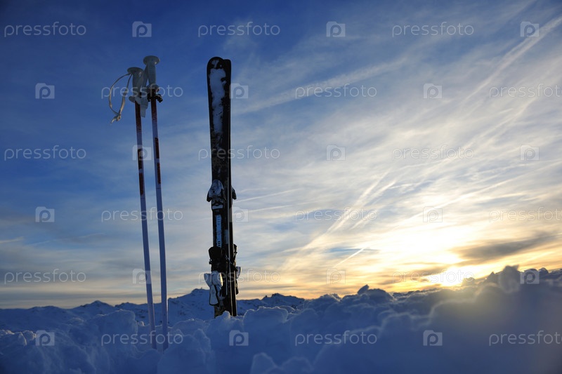 Горные лыжи стоят в снегу на фоне красивого заката