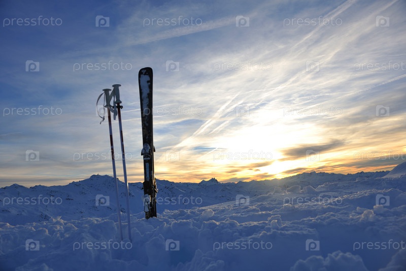 Горные лыжи стоят в снегу на фоне красивого заката
