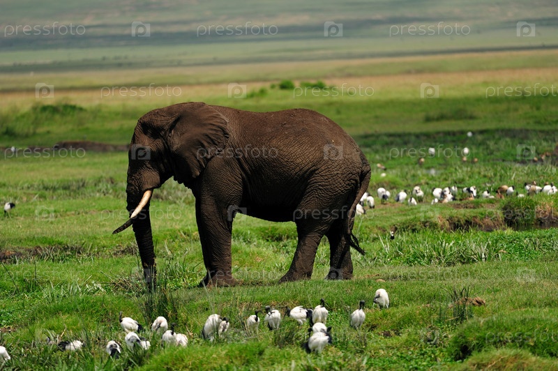 Слон и стая птиц в природе