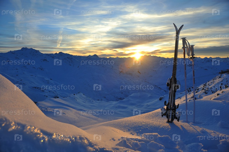 Горные лыжи стоят в снегу на фоне красивого заката