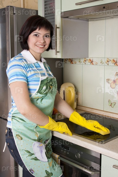 Молодая женщина, чистит плиту на кухне. улыбающаяся женская стиральная печь