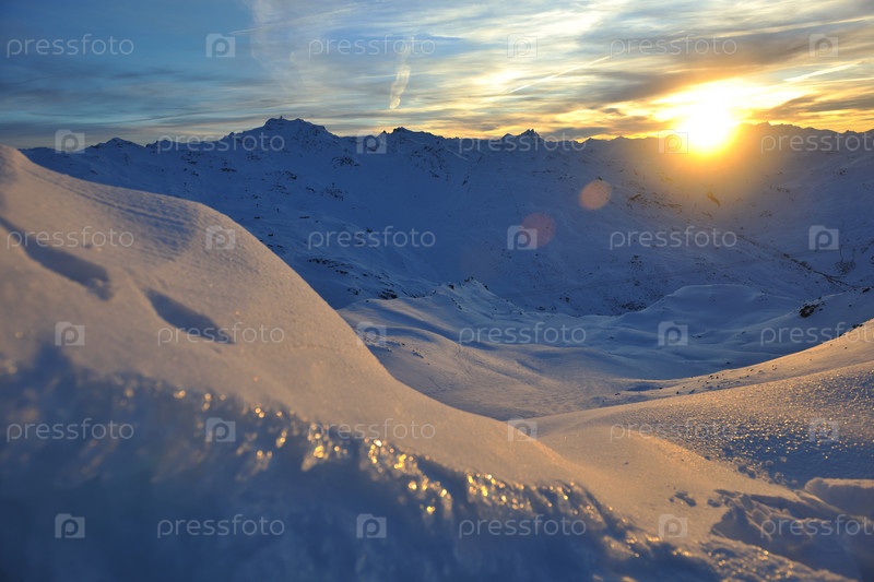 Закат в заснеженных горах французского горнолыжного курорта Валь Торанс
