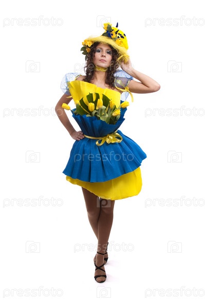 Элегантная модель с розами в шляпе и с тюльпанами, гвоздикой в платье от упаковки