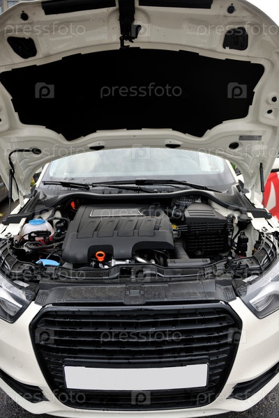 Двигатель в открытом капоте нового автомобиля