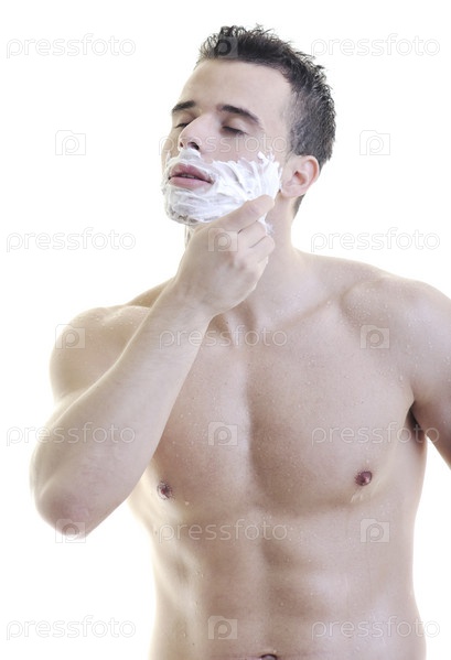 Молодой человек бреется, изолированный на белом фоне