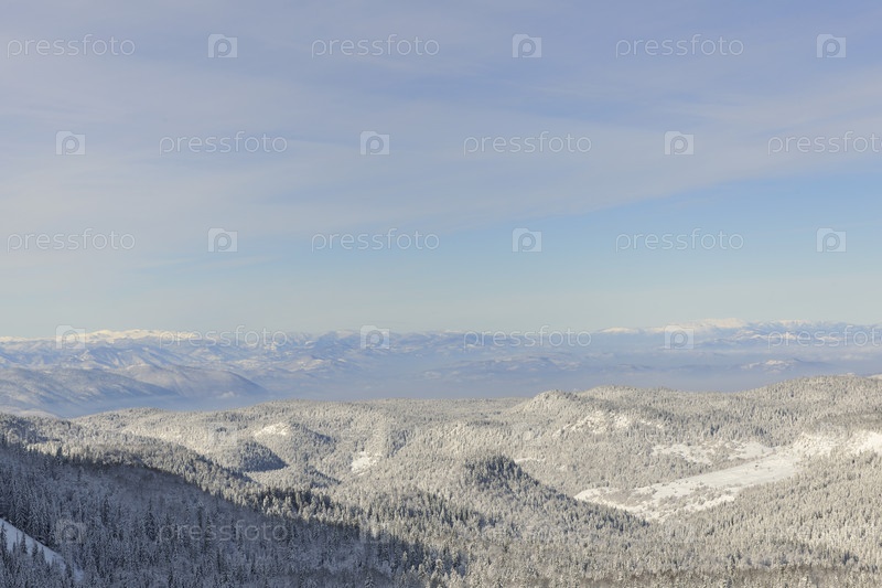 Зимний горный пейзаж с заснеженными пиками в солнечный день