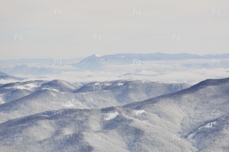 Зимний горный пейзаж с заснеженными пиками в солнечный день