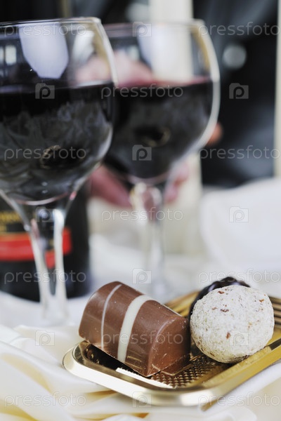 Роскошные сладкие пралине и шоколад с бокалами вина
