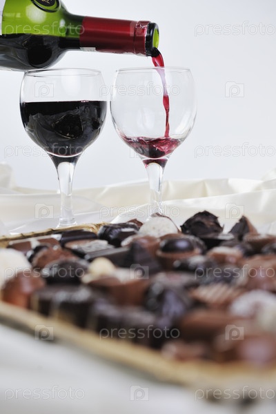 Роскошные сладкие пралине и шоколад с бутылкой вина и бокалами