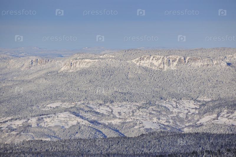 Зимний горный пейзаж с заснеженными пиками в солнечный день