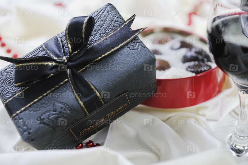 Роскошная коробка с пралине и шоколадными конфетами и бокал вина