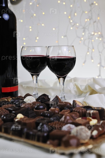 Вино, шоколадные конфеты и пралине на фоне новогодних украшений крупным планом