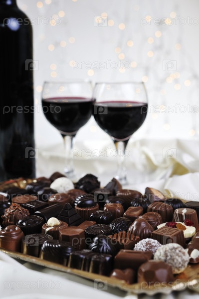 Вино, шоколадные конфеты и пралине на фоне новогодних украшений крупным планом