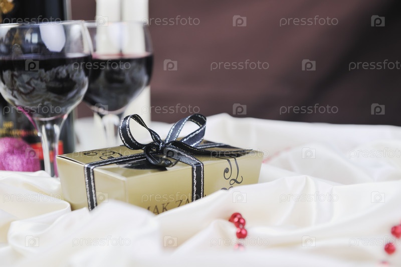 Вино, шоколадные конфеты и пралине на фоне новогодних украшений крупным планом