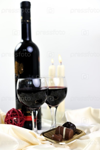Вино, шоколадные конфеты и пралине на фоне новогодних украшений крупным планом