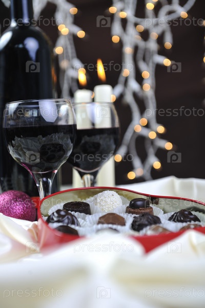 Вино, шоколадные конфеты и пралине на фоне новогодних украшений крупным планом