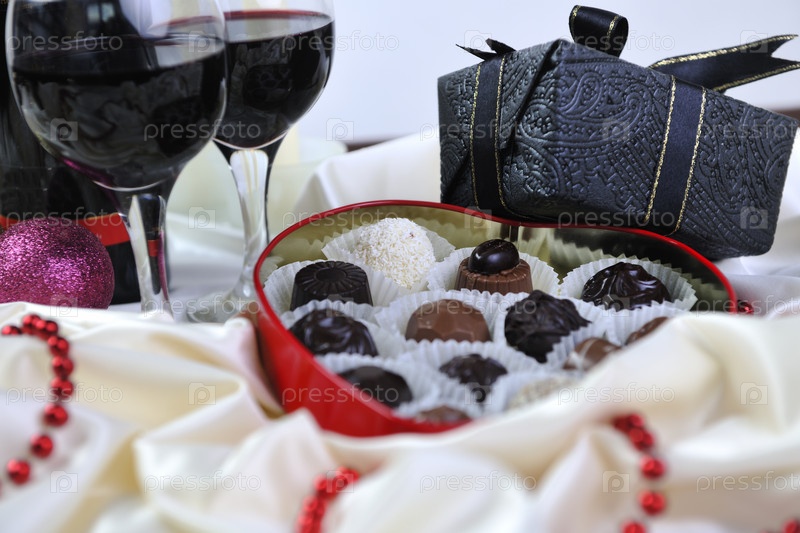 Вино, шоколадные конфеты и пралине на фоне новогодних украшений крупным планом