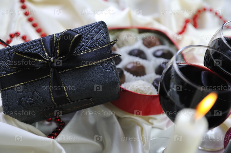 Вино, шоколадные конфеты и пралине на фоне новогодних украшений крупным планом