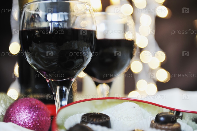 Вино, шоколадные конфеты и пралине на фоне новогодних украшений крупным планом