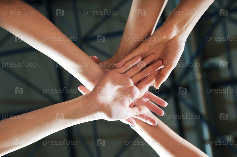 Группа девочек из волейбольной команды держится за руки на спортивной площадке
