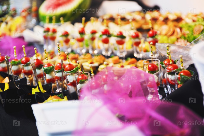 Фрукты, овощи, мясные и рыбные блюда на банкетном столе