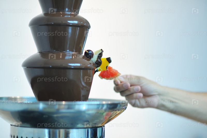 Шоколадный фонтан и свежие фрукты на палочке в руке на свадебном банкете