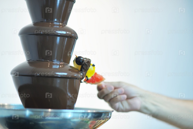 Шоколадный фонтан и свежие фрукты на палочке в руке на свадебном банкете