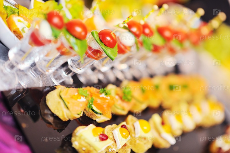 Фрукты, овощи, мясные и рыбные блюда на банкетном столе